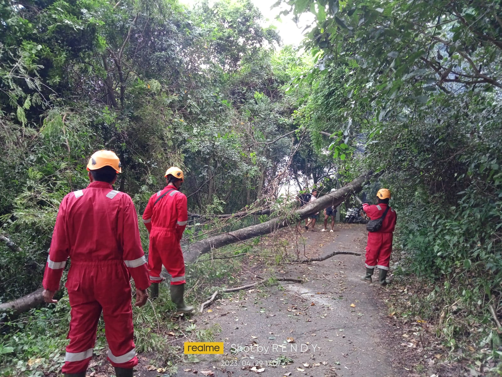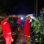 Menerima laporan pohon tumbang tim melakukan penanganan kelokasi dan membuka akses,jenis pohon diketahui Belalu yang berdiameter ±30 cm dan panjang ±15 meter ini tumbang menutupi akses jalan rabat beton menuju Villa.Tim sudah dapat melakukan penanganan dan pembersihan.