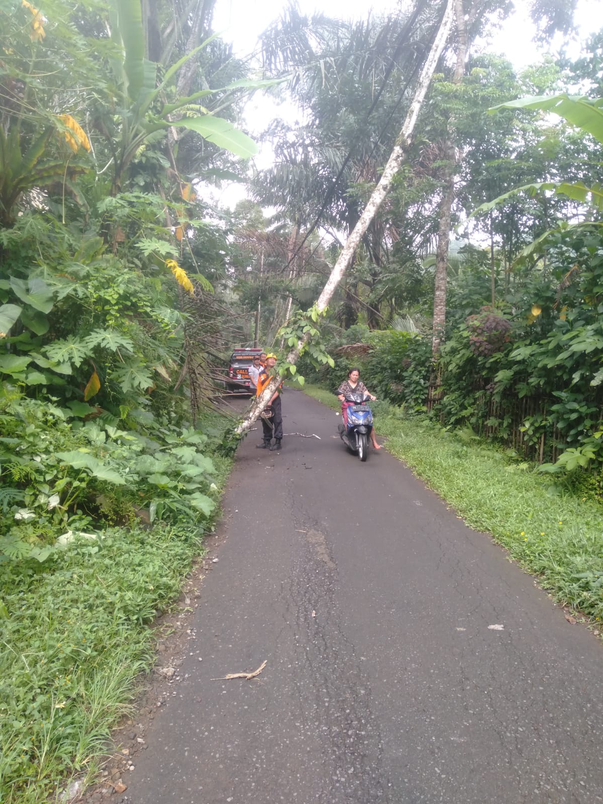 Rabu, (10/5) informasi dari Kadus Pengawan, bahwa telah terjadi pohon tumbang berada diatas badan jalan dan menimpa kabel listrik milik PLN tepatnya di Banjar Dinas Pengawan, Desa Sibetan, Kecamatan Bebandem. Sesuai informasi dari Kadus Pengawan tersebut operator Pusdalops mengarahkan Tim TRC Regu III menuju ke lokasi kejadian untuk melakukan penanganan, untuk saat ini pohon jenis Sandat dengan panjang -+20 meter dan dengan diameter 20 Cm sudah dapat ditangani dan akses jalan sudah kembali normal.