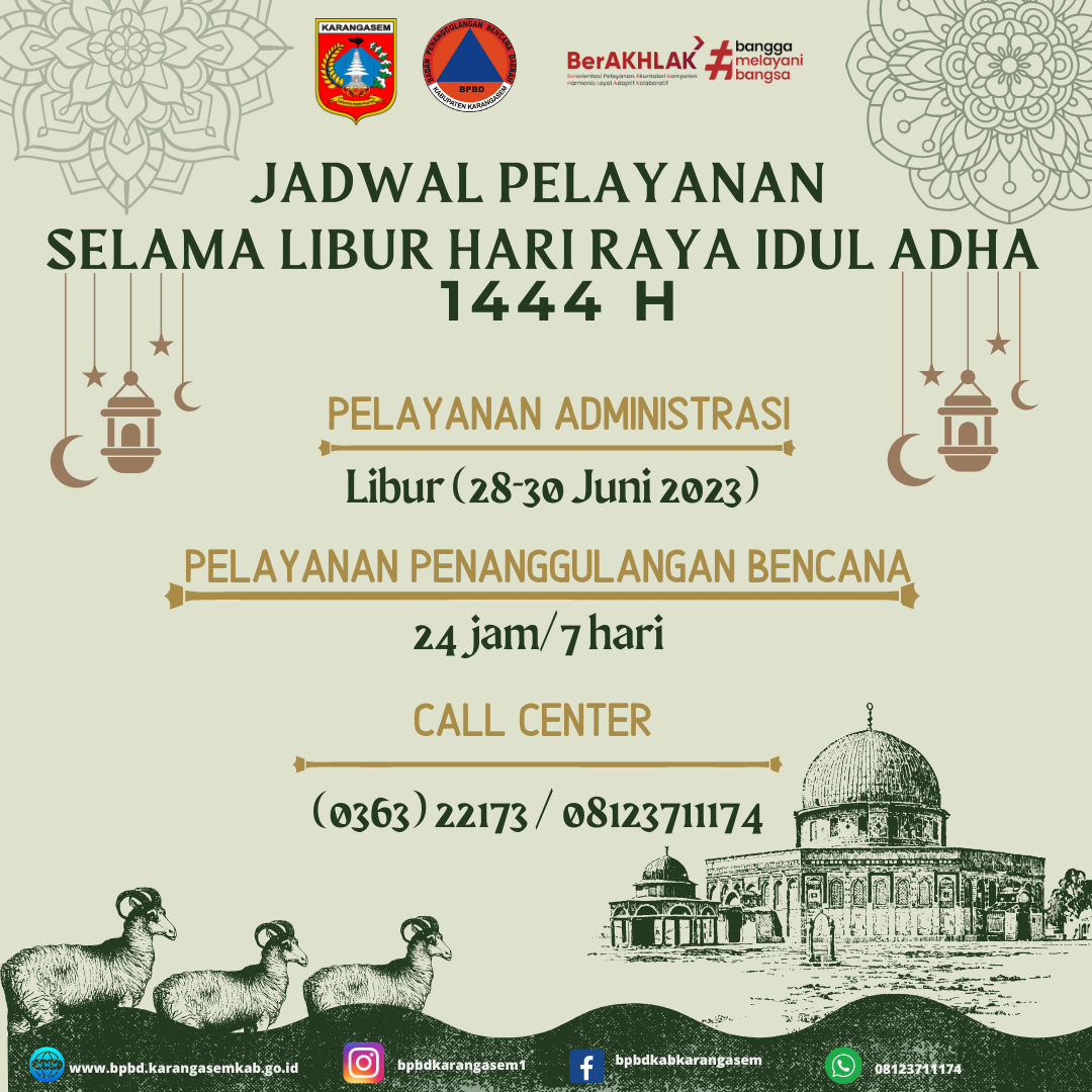 Sehubungan dengan Hari Libur Nasional dan Cuti Bersama dalam Rangka Menyambut Hari Raya Idul Adha 1444 Hijiriah maka BPBD Kabupaten Karangasem membuka pelayanan kepada masyarakat sebagai berikut: